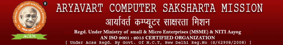 ARYAVART COMPUTER SAKSHARTA MISSION UNDER ACSS REGD. BY GOVT. OF N.C.T., NEW DELHI. Regd. Under Ministry of Small & Micro Enterprises (MSME). AN ISO 9001 : 2015 CERTIFIED ORGANIZATION